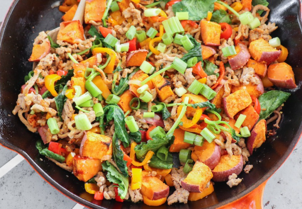 Start by roasting cubed sweet potatoes until they’re tender and lightly caramelized. While those cook, heat a skillet and brown your choice of ground meat along with diced bell peppers. Once the meat is fully cooked, add the roasted sweet potatoes and a handful of greens.